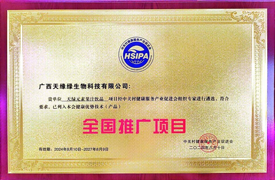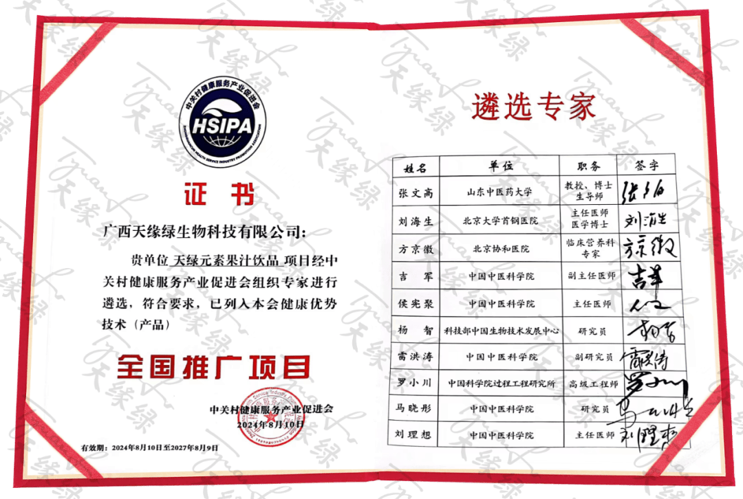 2024年8月10日,天緣綠集團(tuán)迎來(lái)了歷史性的榮耀時(shí)刻——母公司廣西天緣綠生物科技有限公司主研產(chǎn)品『天綠元素』,經(jīng)過(guò)中關(guān)村健康服務(wù)產(chǎn)業(yè)促進(jìn)會(huì)嚴(yán)苛而權(quán)威的遴選流程,憑借其卓越的產(chǎn)品品質(zhì)、創(chuàng)新的技術(shù)優(yōu)勢(shì)以及廣泛的市場(chǎng)潛力,正式被列入中關(guān)村健康服務(wù)產(chǎn)業(yè)促進(jìn)會(huì)健康優(yōu)勢(shì)技術(shù)(產(chǎn)品)全國(guó)推廣項(xiàng)目