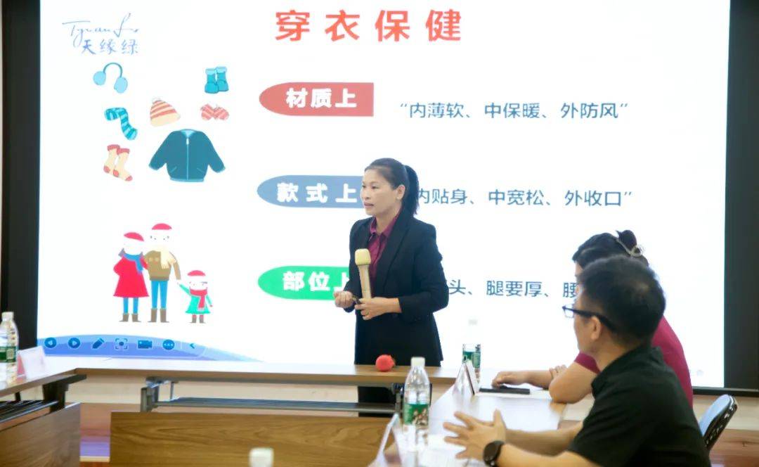 隨后,國家高級(jí)健康管理師黃秀森老師作為主講嘉賓,為大家?guī)砹艘粓鼍实亩颈=≈R(shí)講座。黃老師憑借豐富的專業(yè)知識(shí)和實(shí)踐經(jīng)驗(yàn),深入淺出地講解了冬季常見疾病的種類及預(yù)防措施。她特別強(qiáng)調(diào)了穿衣、飲食、起居、運(yùn)動(dòng)四個(gè)方面在冬季保健中的重要性,并穿插分享了諸多實(shí)用的小技巧,如怎么選擇合適的保暖衣物、冬季男女養(yǎng)腎喝兩湯以及冬季泡腳的注意事項(xiàng)等,這些實(shí)用的知識(shí)技巧讓在場的聽眾受益匪淺。